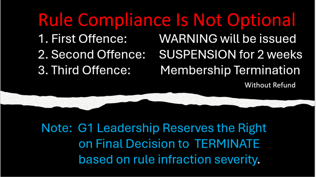 - All Members are expected to report to the Leadership Team any failures by others to follow membership rules. The Leadership Team will appropriately address the violation. Certain violations, as well as repeated abuses/violations, can result in termination of membership without refund.